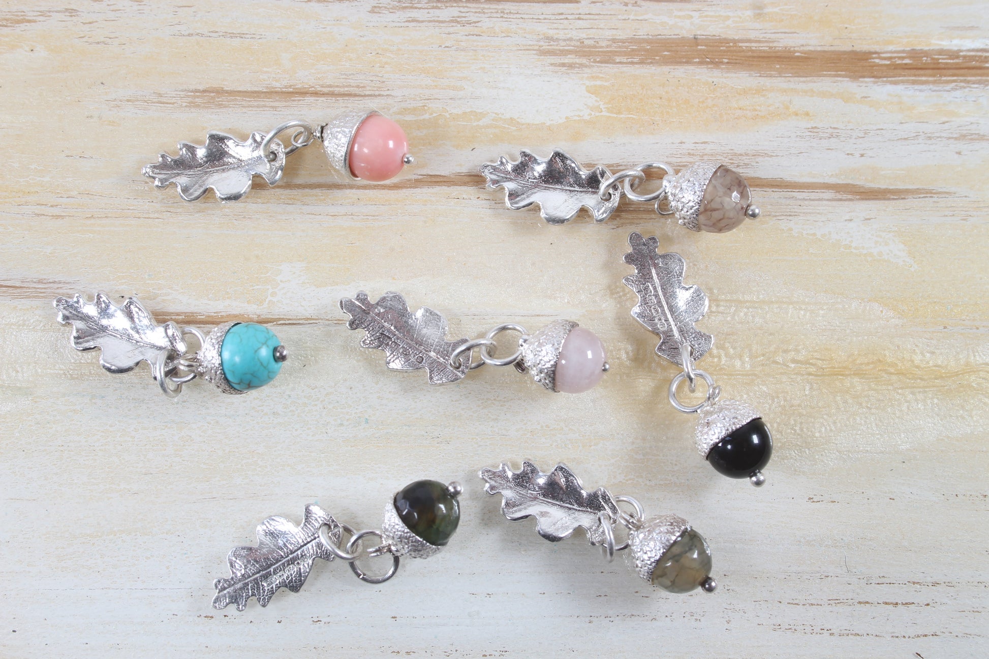Assorted colour acorn charms approx 8mm in diameter, with sliver oak leaf. No chain.