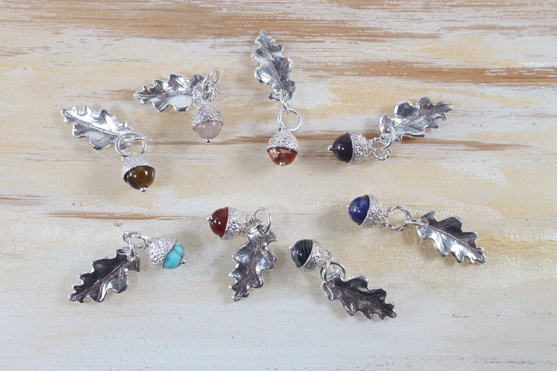 Assorted colour acorn charms approx 6mm in diameter, with sliver oak leaf. No chain.