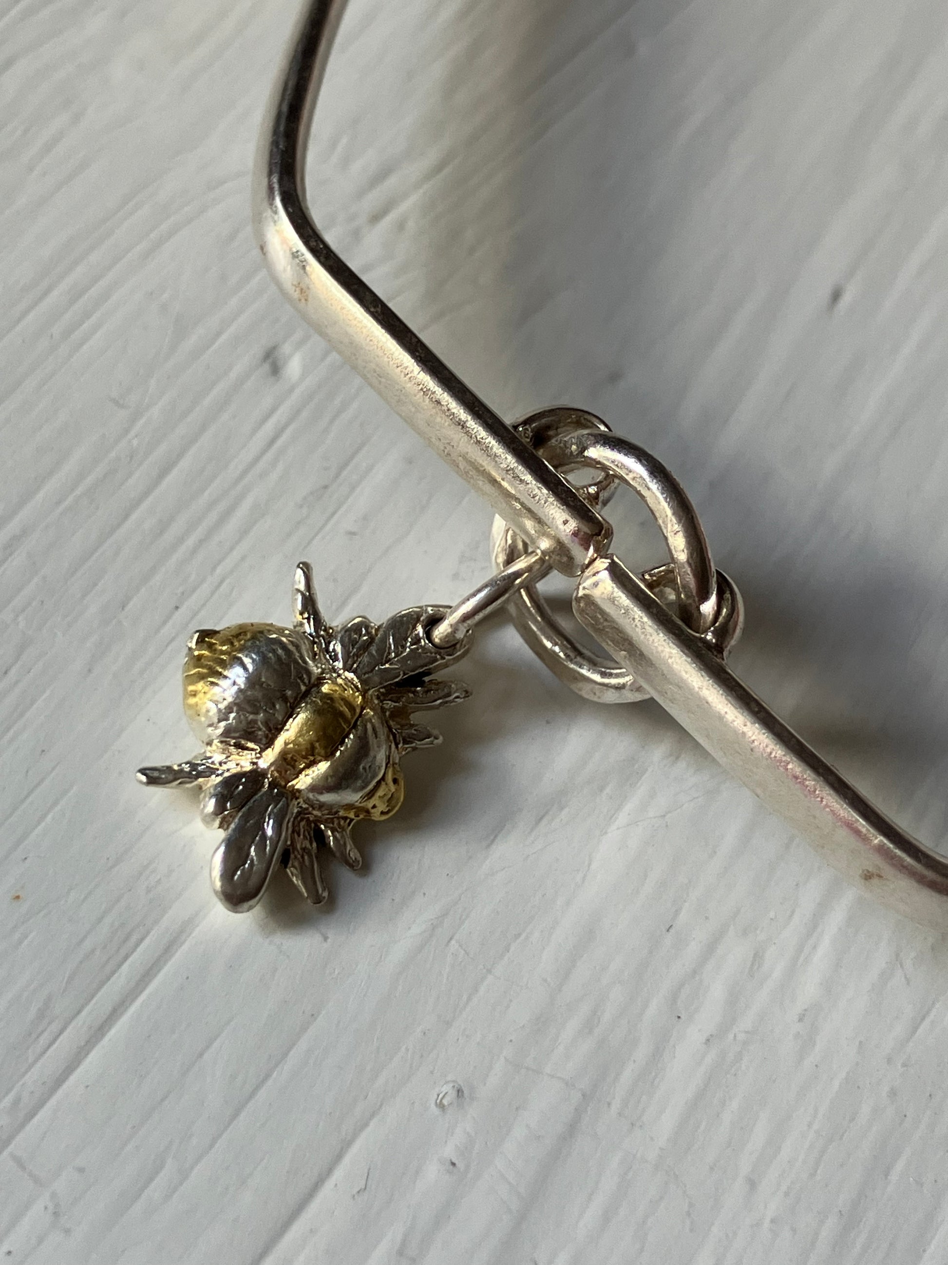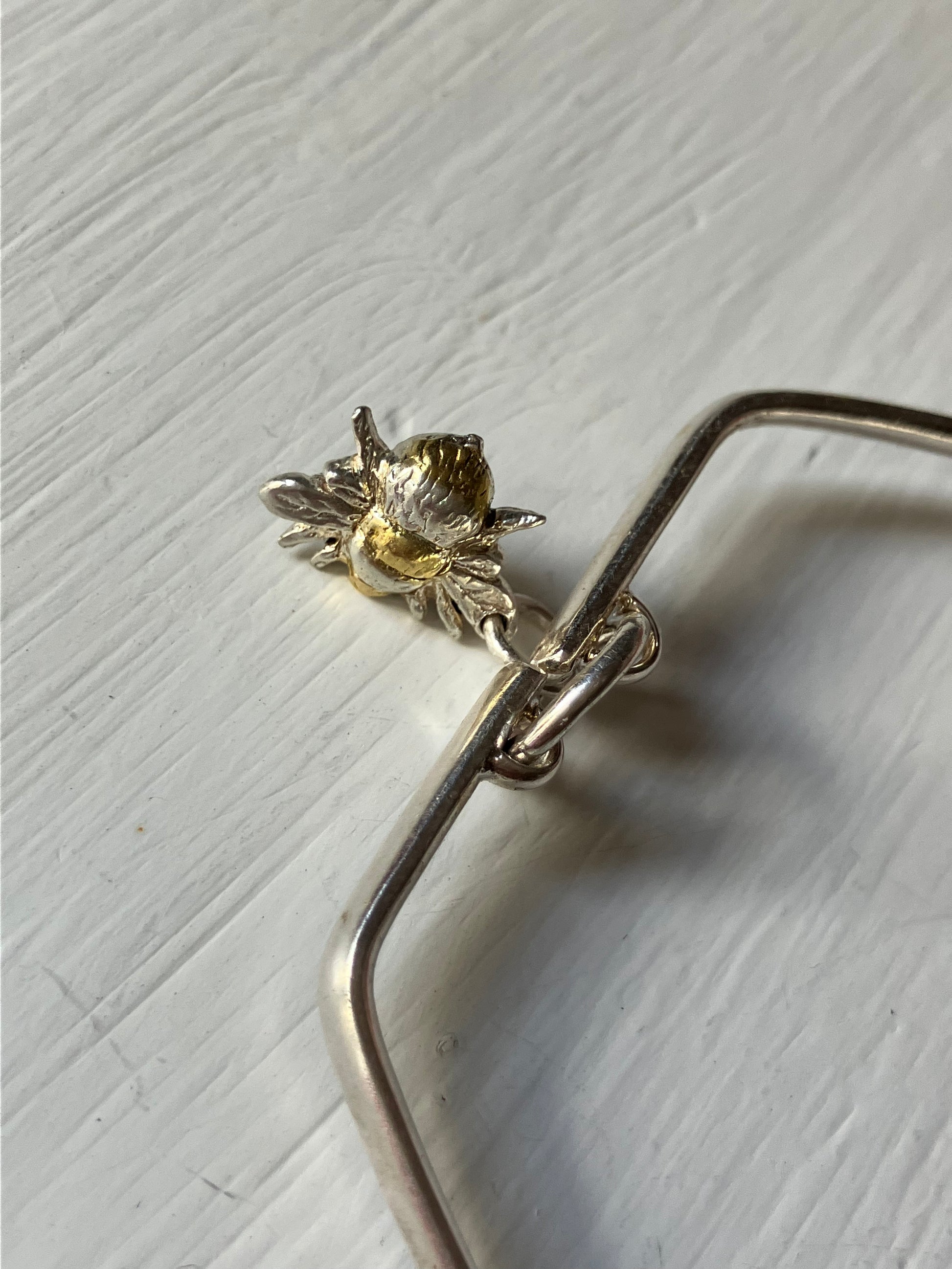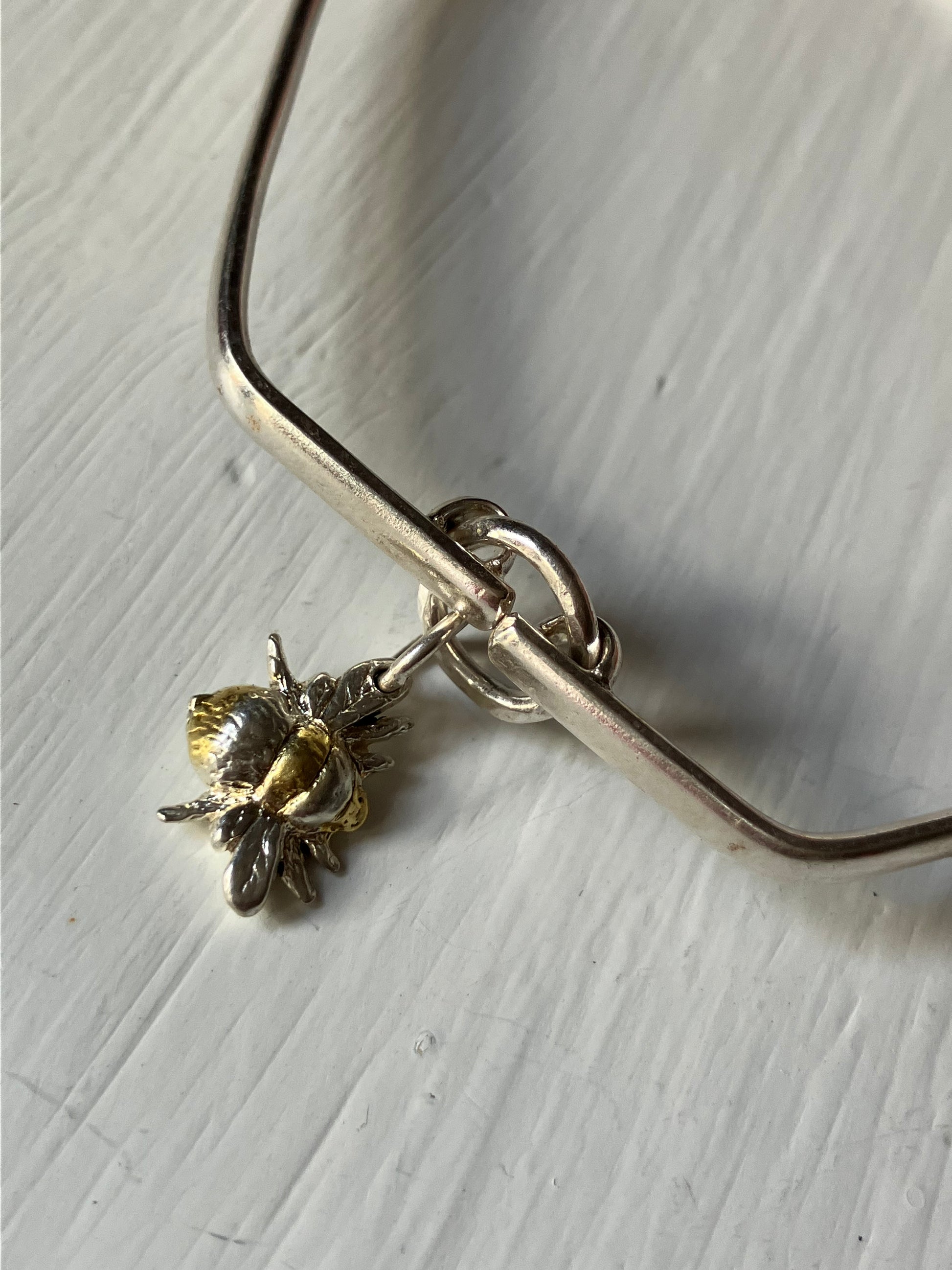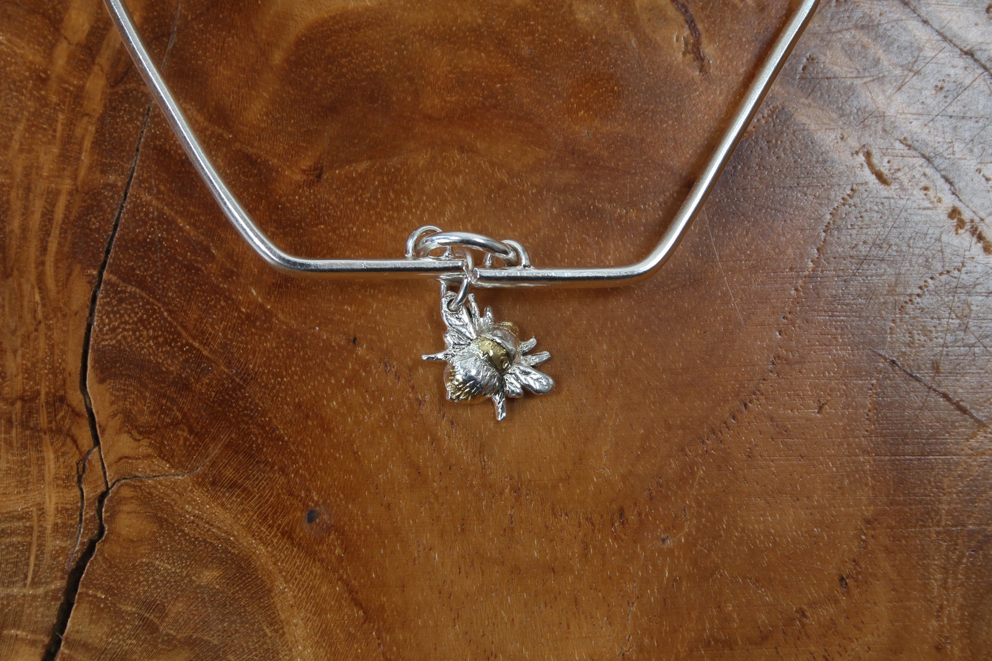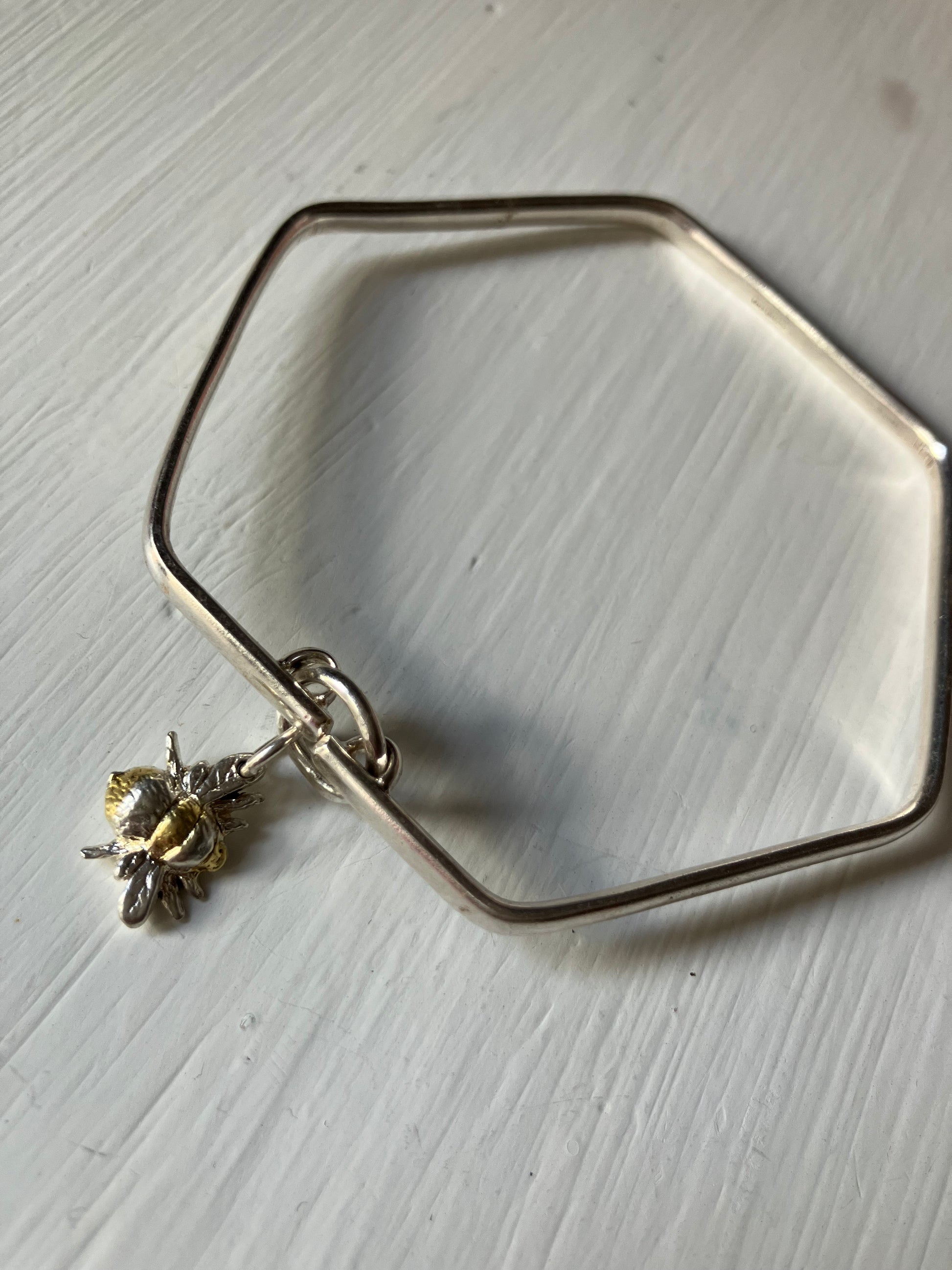Hexagonal Silver Bangle with Bee pendant. Medium size 7cm wide. Other sizes made to order.