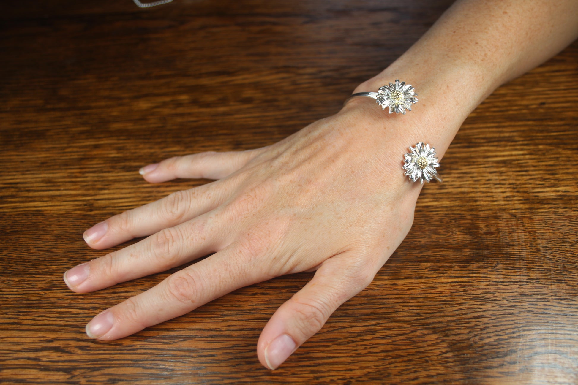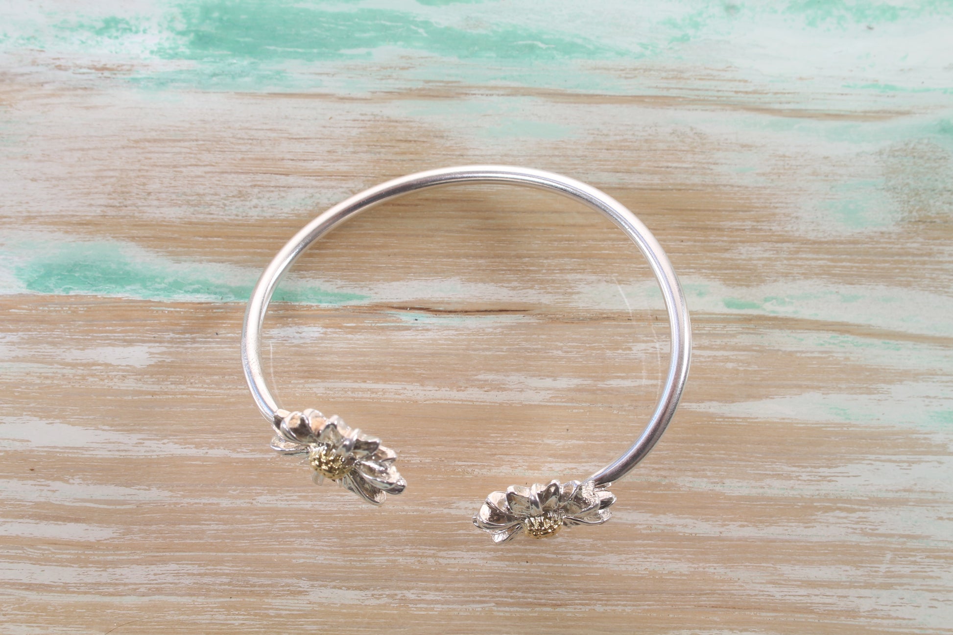 Silver Daisy Bangle with gold plated centres. Please note gold plate may wear with extended use. Diameter 6cm.