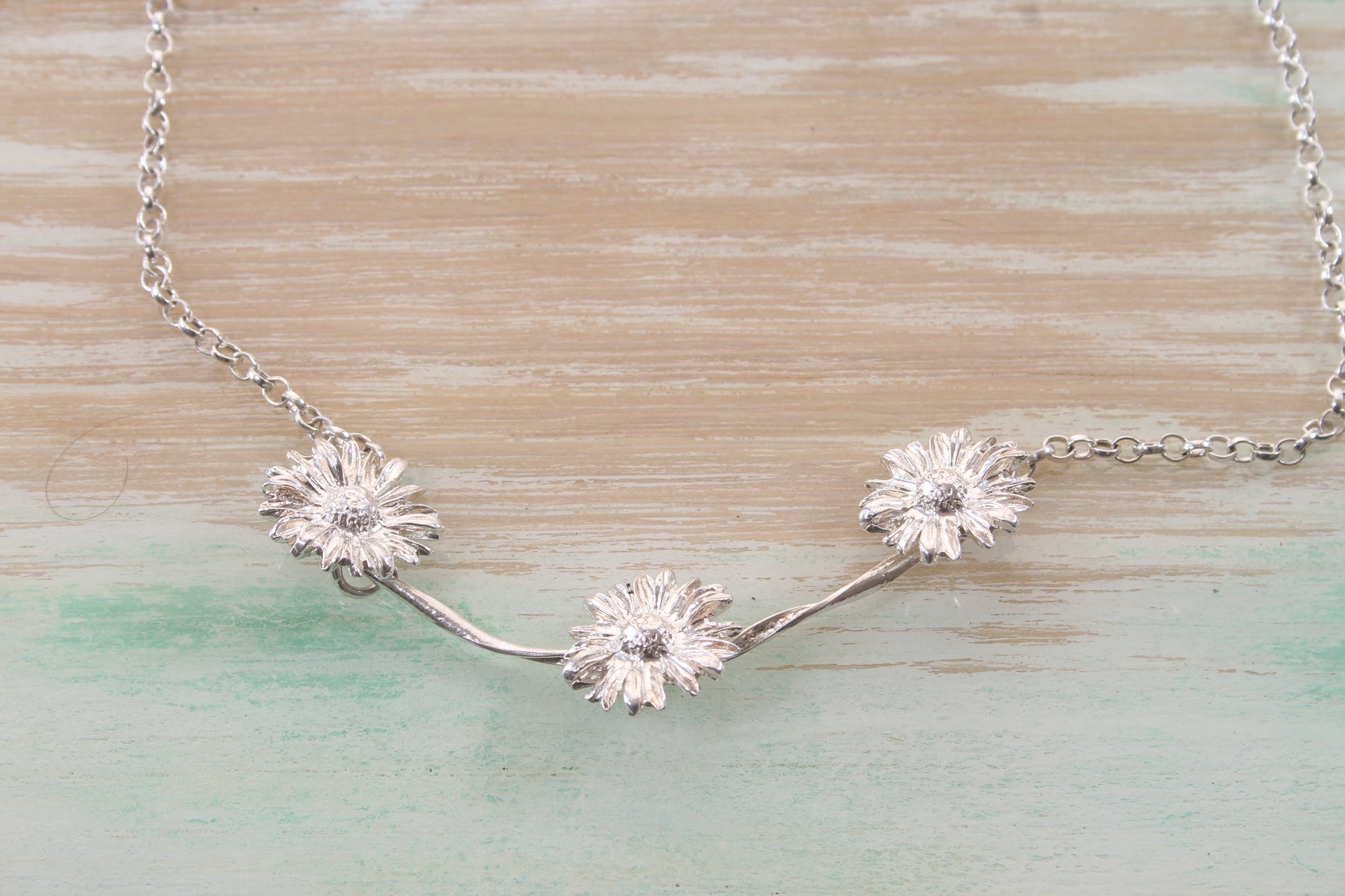 Silver Daisy necklace with 3 silver daisies. Length 38cm clasp to clasp.