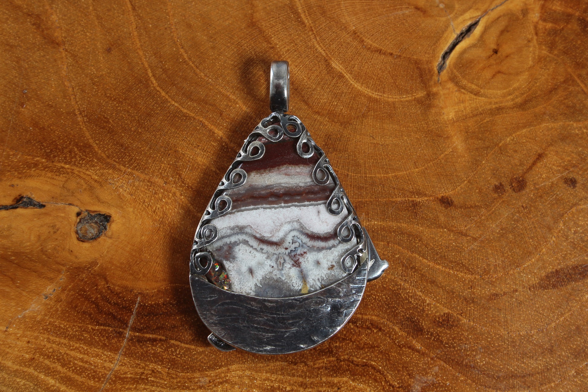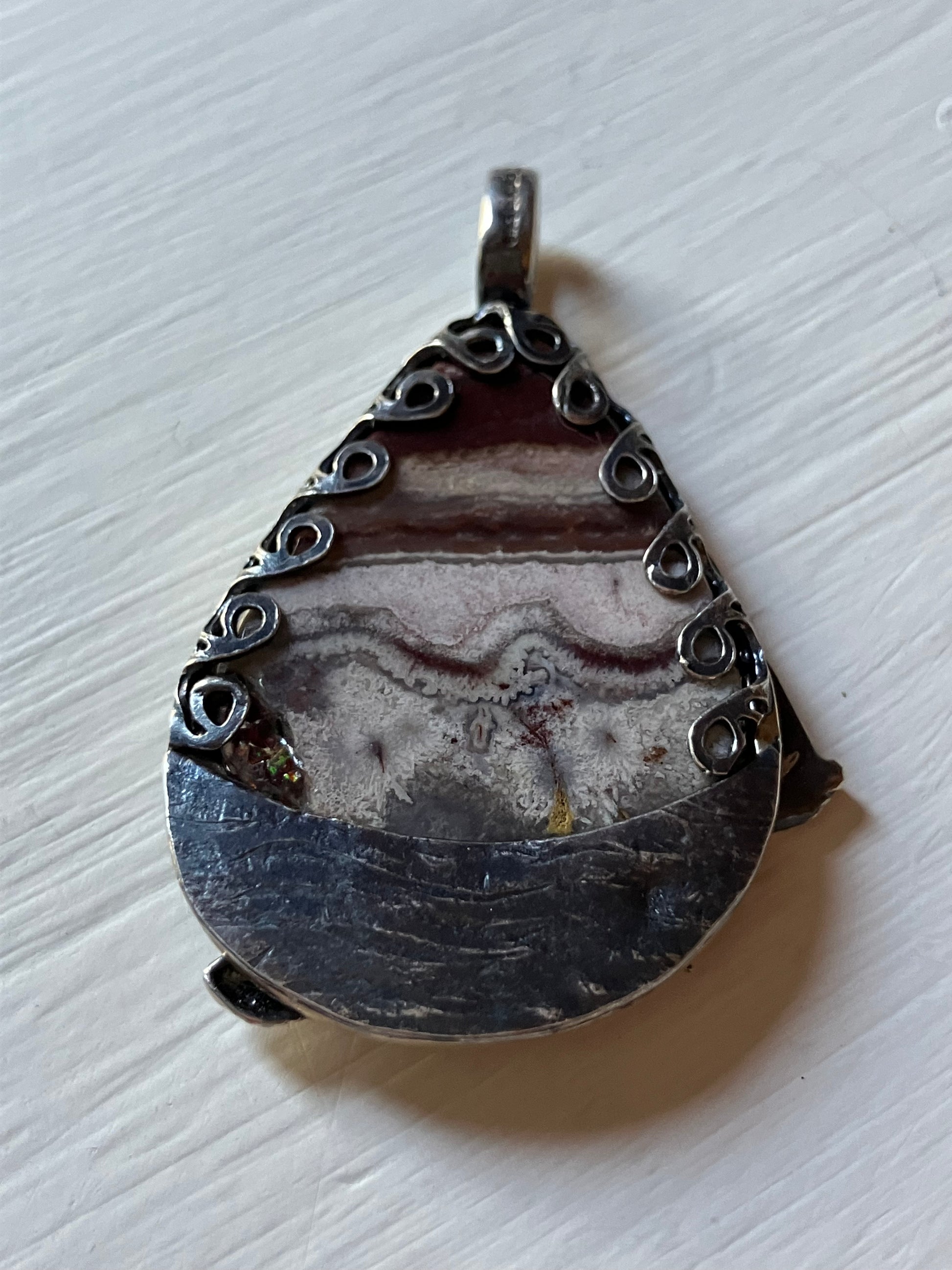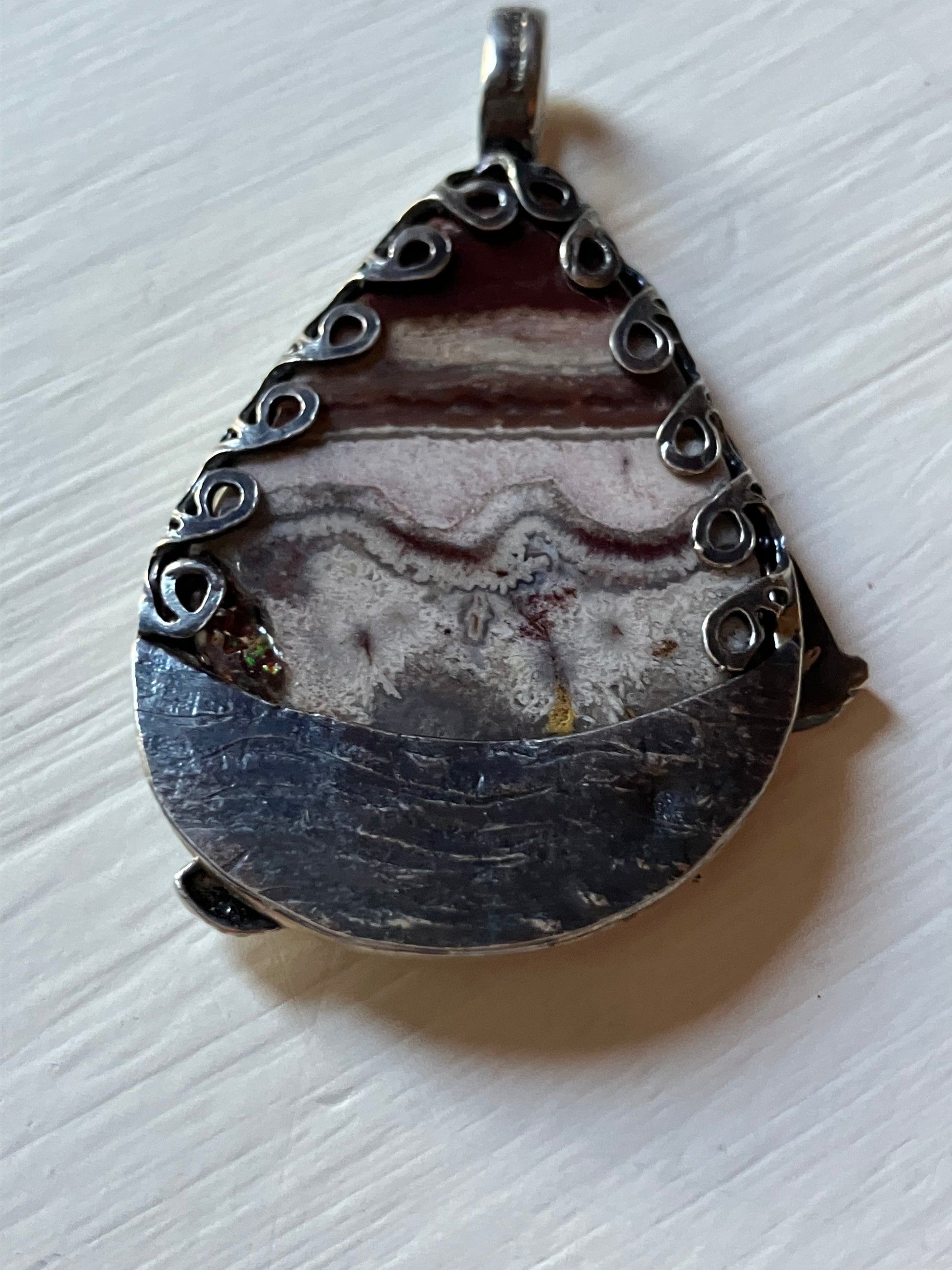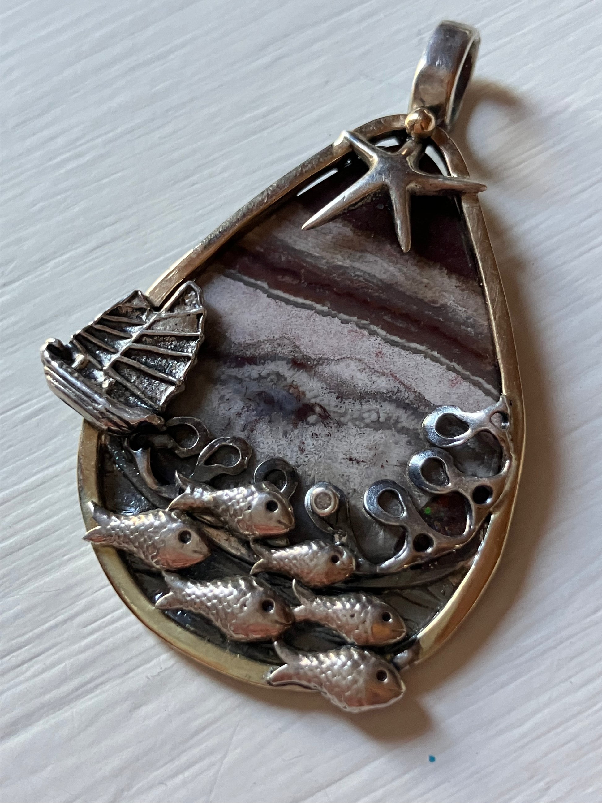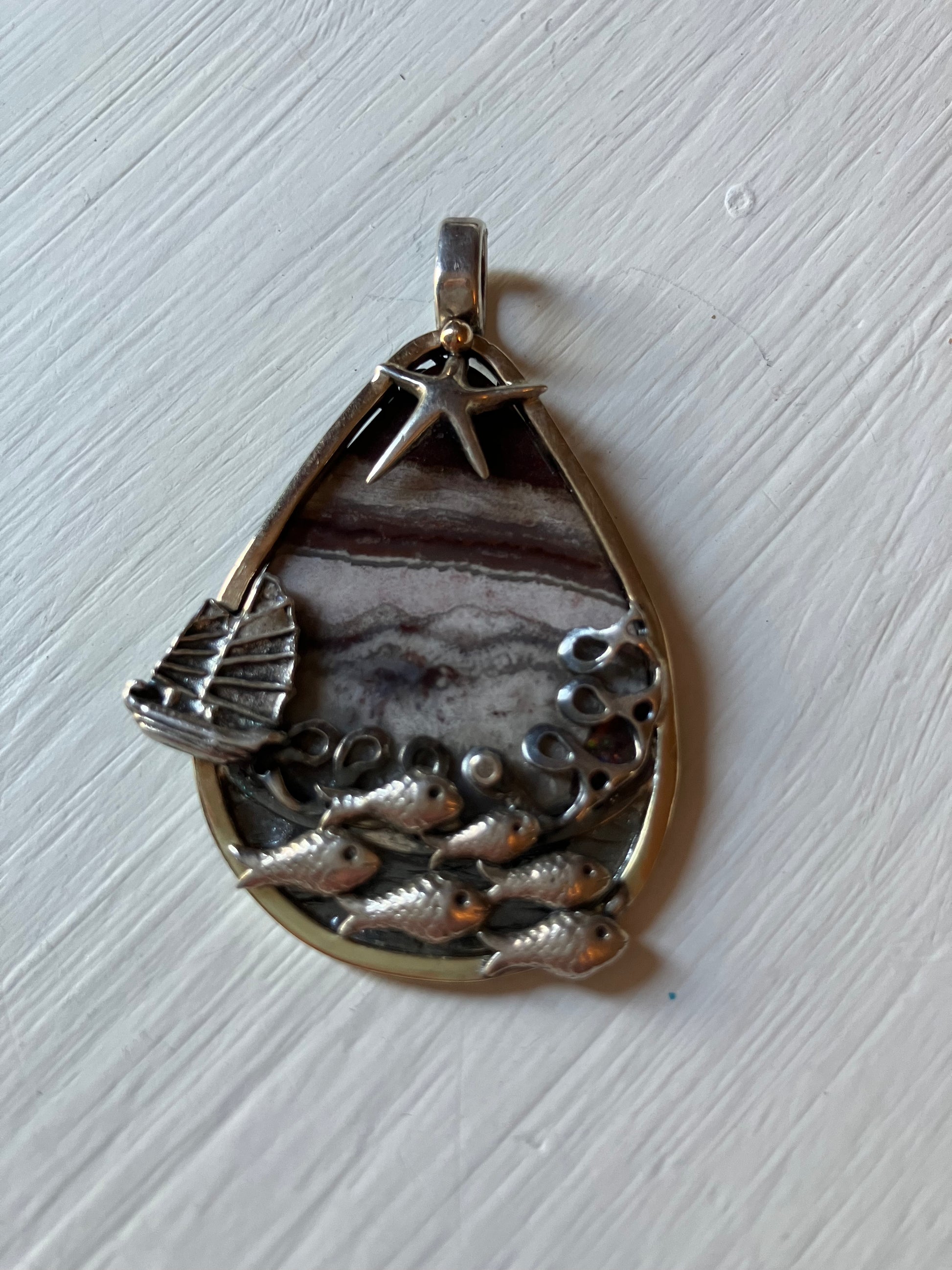 Silver fish shoal, boat and star pendant with picture jasper background and gold frame.