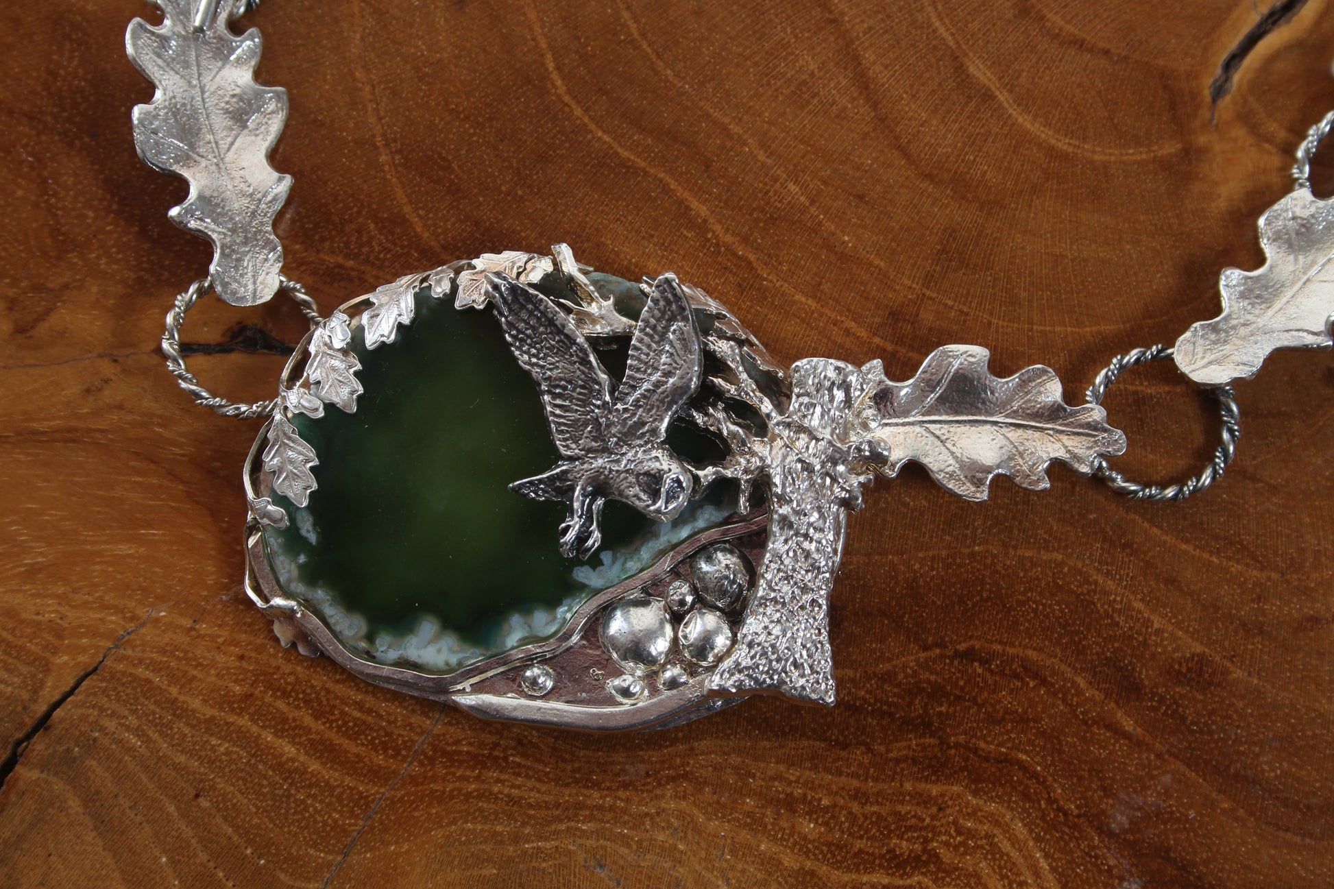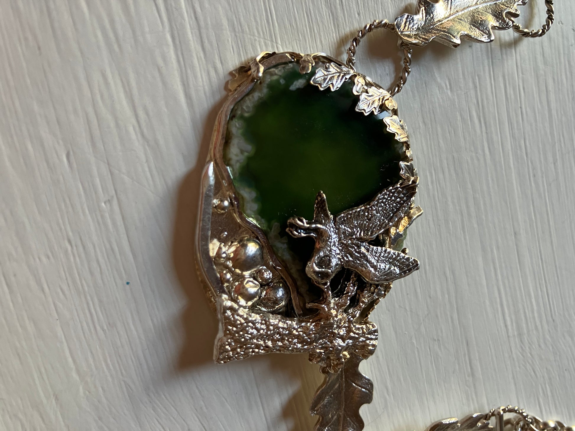 Sterling Silver Owl and oak tree on a green agate slice necklace 5cm wide, 3.5cm tall. Total length 43cm clasp to clasp.