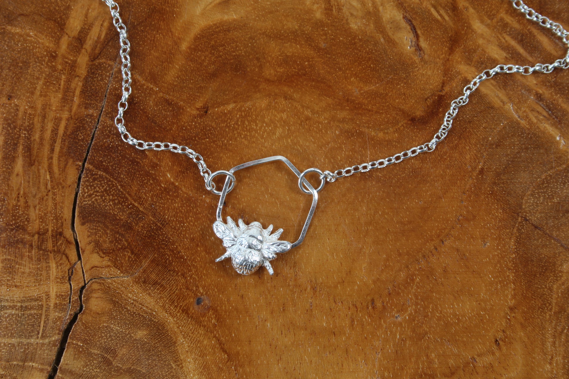 Silver Bee on single hexagonal honeycomb cell with fixed chain. Pendant approx 15mm diameter. Total length 42cm clasp to clasp.