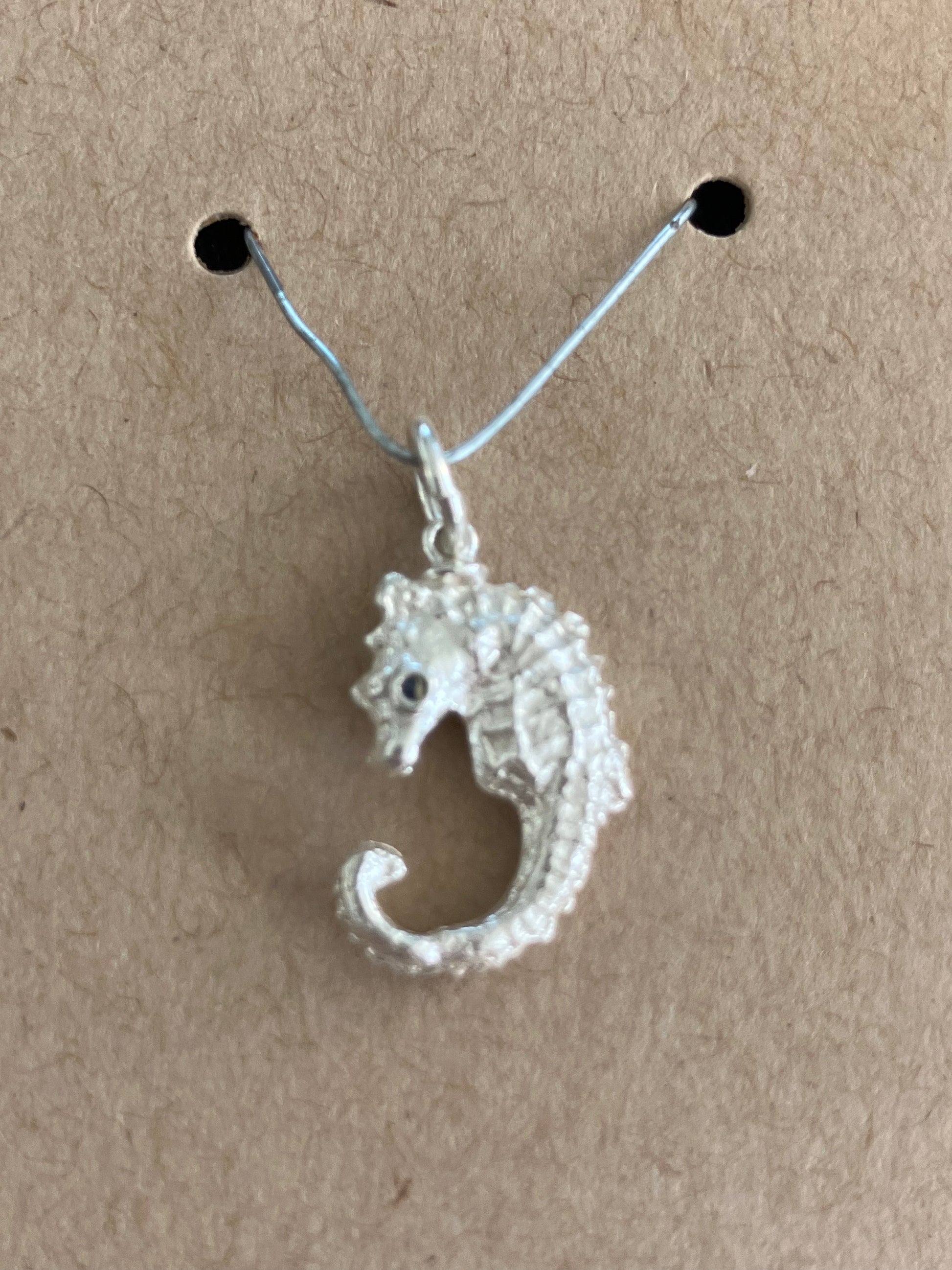 Silver Seahorse pendant with sapphire eyes. Dimensions 1.5cm top to bottom.